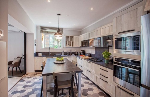 Fully equipped kitchen with oven, microwave, hob, dishwasher, American fridge, wine cellar... leading to a large dining room.