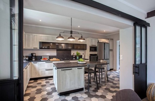 Pool house equipped with 2 refrigerators, a plancha and a hob, with direct access to the pool and indoor kitchen.