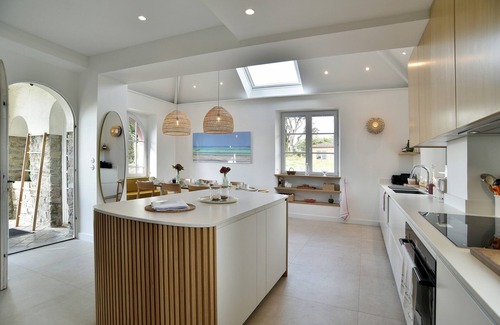 - Large open-plan kitchen with central island and table for 10 people (equipment: Nespresso machine, electric kettle, induction hobs, large oven, microwave, US fridge, toaster, dishwasher, ...)