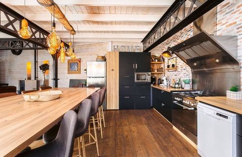 Located in Nuaillé-d'Aunis, the magnificent holiday accommodation Villa la Forge Expérience Bien-Être is built in an industrial loft style. Entirely renovated, the 350 m² property consists of a living room, a kitchen with a dishwasher, 7 bedrooms and 6 bathrooms and can therefore accommodate 16 people. Additional amenities include Wi-Fi, a washing machine as well as a TV. A pool table, a table football table, an indoor whirlpool and a children's play area are also available on the property. 2 baby cots are also available.