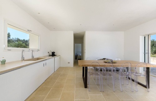 Villa La Guaceta is a charming villa with private pool, consisting of two mirrored units, whose interiors combine modern furnishings with the typical structure of Apulian villas. Both units consist of a spacious living area with a large wooden dining table and a modern kitchen with a minimal and elegant style, equipped with amenities including a dishwasher, an oven, and an espresso coffee machine.