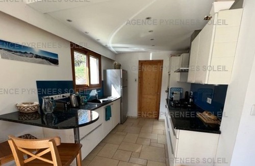 Entrance leading to a bright living room with wood stove, two bay windows overlooking the terrace and the garden, a lounge area, a dining room and a very well equipped kitchen area (LV, oven, 1 fridge + freezer, 4 gas burners, extractor hood, upper and lower storage), a bedroom (160 cm bed/closet) with adjoining bathroom (walk-in shower), and separate toilets.