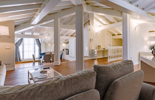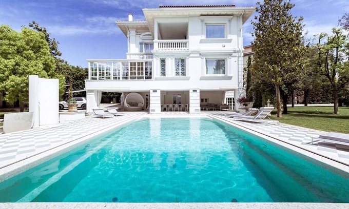 There was once an enchanting villa whose entrance staircase seemed to be exactly like that traversed by the radiant protagonist of a fairy tale on her way to a ball, with elegant carriages driving along her avenue. But this is not a fairy tale of the past, it is the present that you will experience at VILLA LA PERLA BIANCA. Located right in the centre of the prosperous town of Empoli, the villa is protected, as the shell protects its pearl, by a fence and by the majestic trees that surround it. You cannot fail to feel shivers down your spine at the sight of the villa which is seen in all its serenity and splendour at the end of the cypress-lined drive. An abode of another age, built at the beginning of the 20th century, it is an expression of eclectic-neoclassical architecture that emerges from the ornamentation that covers the façade, from the materials that make it up and finish it off; white predominates the interior and exterior with all its power, all its passion and its ability to enhance beauty, elegance and refinement. The interior is enriched with marble and wood, high quality finishes used in the renovation that has been done in the deepest respect for the original characteristics of the period; this is why it seems that time has stopped, whether you are inside or outside the villa, yet, at the same time, you will enjoy the best comforts of the modern age. 700 square metres of simple luxury which will immediately captivate you, four floors where you will find the best place in which you have always wanted to spend your holiday, the best dream in which to find peace of mind and body, just a stone's throw from history, art, culture, shopping, food and wine. Majestic staircases and a lift connect the floors from the basement to the attic; on the ground floor the 210 square metres consist mainly of the living areas, reading rooms, a beautiful fireplace as well as the kitchen and dining room and also a private bedroom with bathroom in a style that combines elegance and practicality, modernity with neoclassical inspiration. On the first floor are three bedrooms, including the master suite which includes a large private sitting room, a dressing room and a magnificent bathroom with shower and a round tub located just below the window overlooking the pool, plus a spectacular terrace for exclusive use. The attic, 145 square metres of loft with white beamed ceiling and wooden floor, an exclusive, completely independent, space with kitchen, living area, sitting room, double bedroom with bathroom and a fully furnished pocket terrace with a wonderful view over the roofs of the town. During the day you can go to the basement to enjoy the best of relaxation in the fitness and wellness area that the villa reserves for its guests; from here you go directly out to the swimming pool which can also be used in winter as it is fitted with a modern cover that turns it into a closed and heated area in the coldest periods. The park is mainly green lawn that can be admired in all its beauty from the large dining area next to the swimming pool. The contrast between old and modern blends perfectly together, making this villa a real pearl of beauty in all its splendour.
