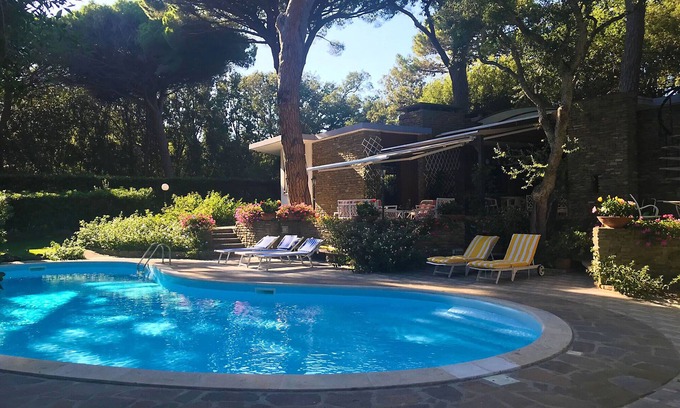 This beautiful villa, with a nice ‘vintage look’, is situated in Punta Ala’s most prestigious residential area near the yacht harbor and the sea, protected by a large garden and shadowed by high secular pine trees. The Villa offers great outdoor spaces, furnished terraces and a wonderful private swimming pool.