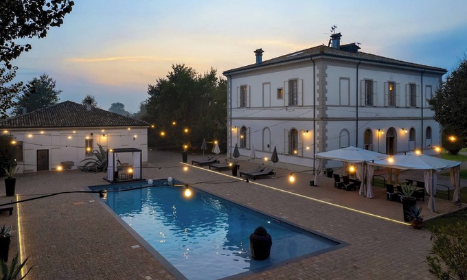 Villa Laguna is a historic villa near Faenza, originally built at the end of the 19th century as a summer residence of the Counts Camerini. Surrounded by a large private park and refreshed by the sea breeze, the property includes the main villa and an annex, with large terraces, a spacious pool and a wellness area with a hot tub. Unique in its kind, the villa has large interiors full of original details: Trani marble floors, vaulted ceilings, frescoed epigraphs on the ground floor and a bedroom that once served as a chapel. Today it can accommodate up to ten people in five bedrooms, all with en suite bathrooms, as well as a large living area and a modern kitchen. In the adjoining annex there is a private wellness area with massage rooms, sauna, steam cabin, gym and a hot tub. An outdoor dining area under linden trees and a shaded lounge terrace with garden views complete the picture.