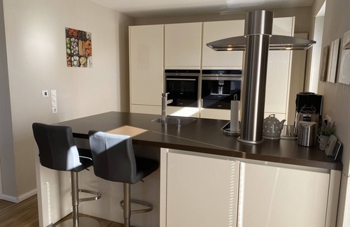 Open high-tech kitchen with island, xxl fridge with biofresh, high oven, induction hob, warming drawer, dishwasher and an integrated fully automatic coffee machine.