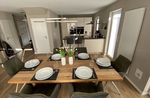 Designed as a low-energy house, it has controlled living space ventilation, floor-to-ceiling windows with triple glazing, LED lighting, underfloor heating and a solar thermal system. This means that the additional costs for electricity and gas in summer are low 3-4 €, in winter around 7-8 € per day.