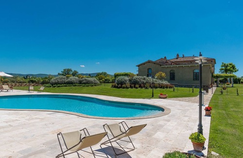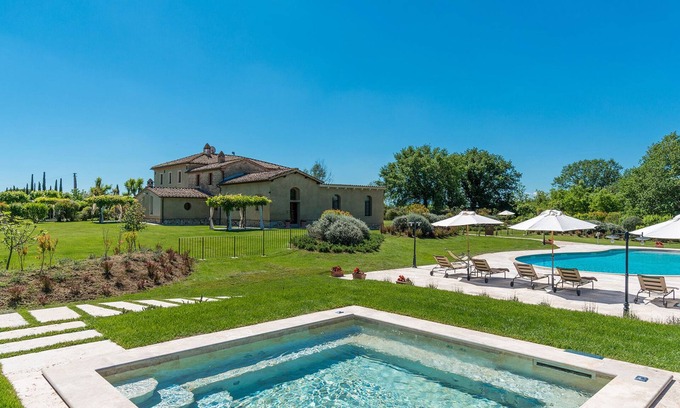 Villa Le Chiarne is a magnificent property obtained through careful restoration that has transformed an old 19th century farm into an exclusive place of relaxation and well-being. The imposing structure has been divided into seven suites, equipped for the best comfort possible with great attention to detail, with antique furniture, refined wall decorations and elegant upholstery. It is ideal for accommodating groups of friends and large families who can have their own private spaces but, at the same time, able to share the common areas both inside and outside in the vast garden surrounding the house which is completed by a beautiful swimming pool and two heated hydromassage pools in a panoramic position. Set in the splendid upland of Le Chiarne, heart of the Crete Senesi, and just minutes from the famous spa town of Rapolano, the farm is an excellent base for exploring a territory rich in artistic and cultural proposals. Within easy reach is the Chianti, with its charming villages along the wine routes, and the excellent road network (the highway is just 5 km away) which will take you to Cortona, Montalcino, San Gimignano and Montepulciano as well as to the great art cities of Siena, Arezzo and Florence.