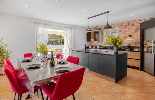 In the commune of Le Thoronet,Cocoonr/Book&Pay Agency offers you this charming 135 m² air-conditioned villa with private swimming pool, which can accommodate up to 8 guests. It features a lovely 20 m² living room, a fully-equipped kitchen, three bedrooms, two bathrooms (with shower) and a 1,050 m² garden. Wifi, bed linen and towels included, we're waiting for you!