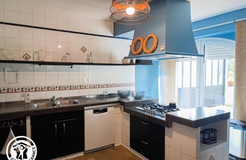 Villa Le Simonet is a beautiful stone house with a contemporary interior of the most beautiful effect, light tones, designer decoration here, paintings there and everywhere, very comfortable and high quality equipment. ..and an impressive double staircase leading upstairs! outside, a covered terrace opening onto a private swimming pool much appreciated during our very hot summers, and a park where young and old can relax... At Villa Le Simonet, everything has been thought out to comfortably accommodate a group of friends, a family, up to 9 people! Only 3 km from all the shops and services, and its proximity to the unmissable tourist sites of this part of the department, La Villa Le Simonet is ideal for making the most of your holidays! On the ground floor: living room with glass doors opening onto the covered terrace, fully equipped kitchen, laundry room with washing machine and all maintenance and cleaning equipment, wc with washbasin. Upstairs, served by a double staircase: 4 bedrooms (1 bed 180, 1 bed 160, 1 bed 140 and a bedroom with 3 beds 90x200, a separate toilet, 2 bathrooms with very large Italian shower. Covered terrace with fully equipped summer kitchen (30m²) opening onto the private fenced swimming pool (13x8), covered carport (30m²), terrace in front of the house, parking, park. to screw) Cleaning included Wifi throughout the gite and around the swimming pool.