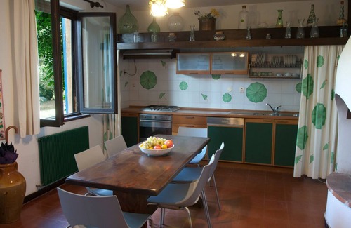 On the large and completely private and enclosed 5 acres property, there is a wonderful centuries old oak, that is among the largest ones in the area. Beneath this monumental oak is a very large table for al fresco dining, and an adjacent bocce-ball court. Closer to the villa, an outdoor traditional wood oven to cook fantastic bread, pizzas, or locally raised whole roasted chicken with potatoes dressed in the centuries old fashion of the local farmers.