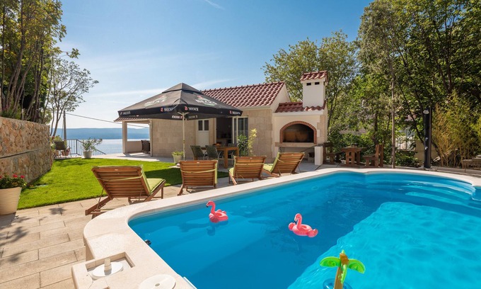 This holiday residence disposes with two large bedrooms with private bathroom with shower. Kitchen is fully equipped with dishes and cutlery; spacious dinning area is perfect for shared meals and comfortable Livingroom makes a great spot to create a new memories. Large terrace will make your morning coffee even sweater and evening wine even tastier. A large pool and a beautiful sea view complete the overall impression of this residence.