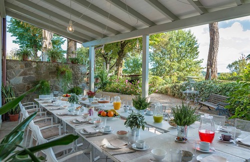The vast, luxuriant, enclosed park that surrounds the property extends over two terraces in front of the villa entrances (on the ground floor and on the first floor) for about 6000 sq m, 4000 of which are lawn with more than 1300 plants and tall trees. The garden with its large set-up areas is characterised by a constant breeze and induces guests to relax in peace with the complicity of the beautiful surrounding countryside (the proximity of the Autostrada del Sole is hidden by the rich vegetation although sometimes, in certain climatic conditions, the sound of traffic can be heard in the distance). In the immediate vicinity of the villa entrances is a veranda for outdoor dining and a seating area. The portico with sofas and tables in front of the annex and facing the pool, is the perfect place for enjoying an apéritif at sunset. The parking area is located immediately after the entrance gate, near the main entrance, with space for up to 14 cars.