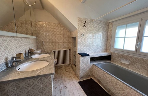 Two bathrooms are available: one on the ground floor with a sink, a shower, a bathtub, and a washing machine. The second one upstairs with a bathtub, a double vanity unit, and a toilet.