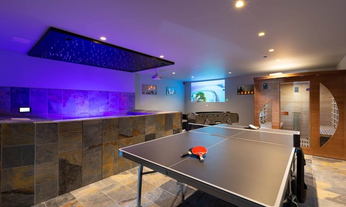 Relax by the indoor pool or sip a drink in the hot tub of this 1-sq-ft vacation home. As for the great indoors, you can try your hand at foosball, or enjoy the WiFi and cable/satellite TV.