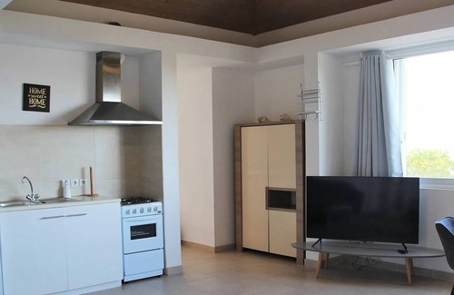 The two main bedrooms are on opposite sides of the living area. Both are accessible from inside and from the terrace. Each has a sizeable bed and comfortable ensuite bathroom, although one of these bathrooms is shared. The third bedroom is smaller and has a full bed and shares the bathroom (accessible only through the second bedroom) with one of the main two bedrooms, making it best suited for the children of the adults in room two. Each of the bedrooms has sea views.