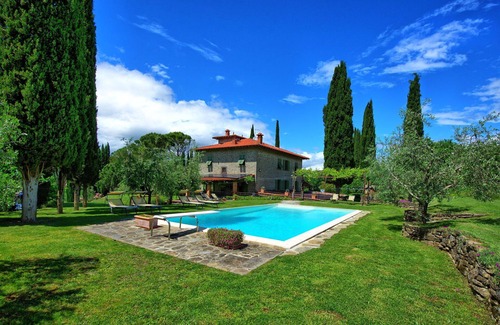 Large, welcoming independent villa with private pool situated on the hills surrounding Arezzo. This property is in quiet and panoramic location and allows to spend a relaxing holiday in close contact with nature. The house is furnished in a rustic style and is surrounded by a big furnished garden with a private pool. This villa is on a 7-hectare estate which is partially farmed and partially cultivated with vineyards producing a nice wine (available to be purchased). The nice town of Arezzo (with railway station) is approx. 10 away and the village of Subbiano is in walking distance (approx. 900 m away).
