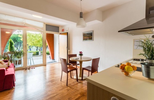– an apartment with living room-kitchen, bathroom with shower and 1 double bedroom. The kitchen is equipped with sink, 2 induction hob, fridge and microwave. Separate entrance, wheelchair friendly, with loggia for exclusive use.