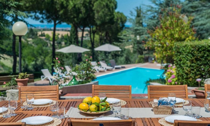 Villa Luisa is a private villa with pool and sea view in Pesaro, in Le Marche region. The elegant historic city center offers many art-historical itineraries and every evening shows and events enliven the summer, like the famous Rossini Opera Festival. Surrounded by a large park rich in plants and centuries-old olive trees, this villa is the ideal place to relax in total privacy and enjoy pleasant days at the beach on the Adriatic coast, which is about 5 km away. Guests have access to a bright panoramic veranda perfect for al fresco eating as well as a barbecue area equipped with table and chairs. The property is completely fenced-in.