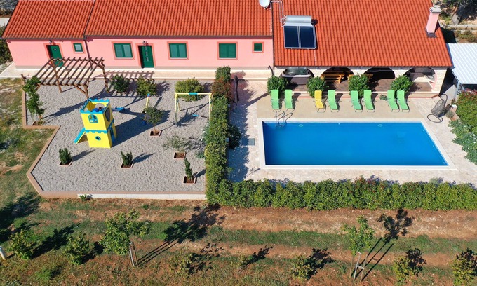 Large swimming pool with spacious area around it. It has 2 dining tables on the porch big enough for 14 people where you can enjoy your evenings in front of the swimming pool. The best thing about the house is its location. It is located in a small village and the only thing that could wake you up in the morning is the sound of birds.