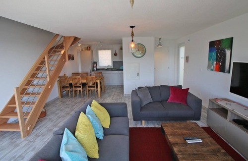 Built in 2016, this non-smoking villa has the BBC low-energy label. Beautiful living spaces, southern exposure, stunning views and a high quality finish are the hallmarks of this holiday home. On the ground floor you will find 1 large living room with direct access to the terrace overlooking the plain of Alsace, 1 open-plan kitchen and 1 separate toilet with wash basin. The fully-equipped kitchen includes a multifunction oven, a ceramic hob, a dishwasher and a fridge-freezer, all made by Siemens.