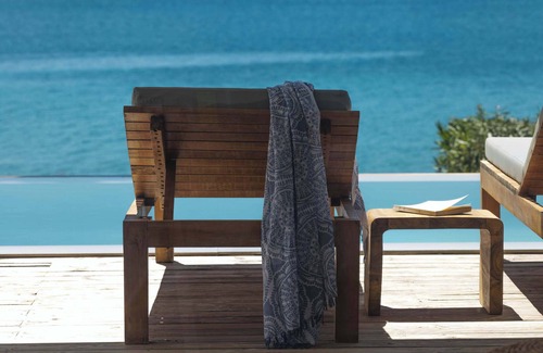Villa Madouri has many positive features to make it an ideal villa to stay, one of the most outstanding advantage, aside from its location, is the amount of outdoor living and dining space that has been created. From the living room, teak doors lead out onto a large, covered veranda and decking area. Here are the first of two outdoor dining areas with in-built sofas and pillows around a large table. The stunning infinity swimming pool has uninterrupted views over the bay and there are plenty of comfortable teak loungers around the pool. On a lower terrace is a small garden with lawns punctuated by an impressive palm tree, and to the left is another decked area with very large outdoor dining and living area that can accommodate 10 guests as well as an additional sun-deck area with loungers set just above the beach. In the evenings, the sunset over the sea is stunning and at night guests can enjoy the tranquillity of the surroundings from the atmospherically lit outdoor entertaining areas.