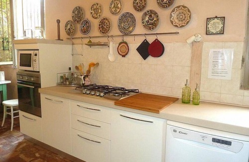 You will be able to enter the kitchen from the dining room and from the corridor. The ceiling of the kitchen has characteristic exposed wood beams. It is equipped with a five-burner gas cooker, an electric oven, a refrigerator with freezer, a dishwasher, a microwave oven and an Italian-style coffee-maker. The dining table can accommodate six guests. From the kitchen a French door will take you to the patio with a view of the garden. The room also has two windows with a view of the garden.