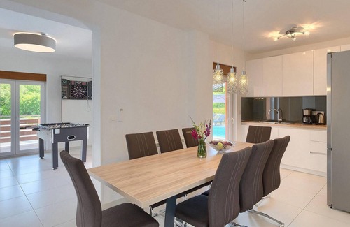 Outside the villa you will find a private pool with sun loungers, which is ideal for refreshment on hot summer days, as well as a covered terrace with comfortable garden furniture. The youngest will surely enjoy the children's playground and trampoline, and the adults will love the covered outdoor dining area with outdoor kitchen and barbecue.The small picturesque village of Stokovci is located near the medieval town of Svetvincenat, the most dominant small town in south-central Istria. Svetvincenat will impress you with the pleasant hospitality of its inhabitants and typical Istrian delicacies, world-famous wines, fresh extra virgin olive oil, homemade brandies and much more. Well-preserved Roman architecture, untouched nature, historical and cultural heritage are part of the Istrian heritage and can be reached within a 5 to 30-minute drive with wonderful views. You can feel the antiquity by discovering the Roman amphitheater in the 3000 year old town of Pula (the largest in Istria), strolling through Porec (the pearl of the Croatian coast and the most visited town in Istria) or visiting the famous St. Euphemia's Church in Rovinj (the most beautiful resort in Istria, a town of art and street artists). We definitely recommend a visit to the Brijuni Islands (Croatia's most famous national park with a safari park) and an 18-hole golf course.