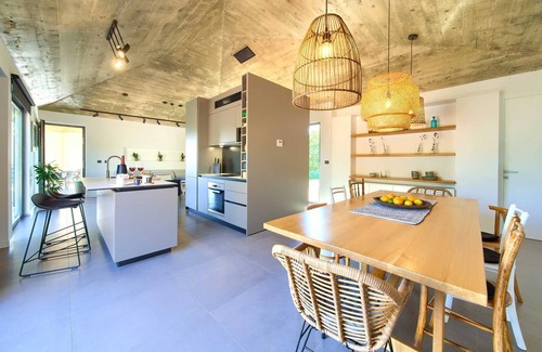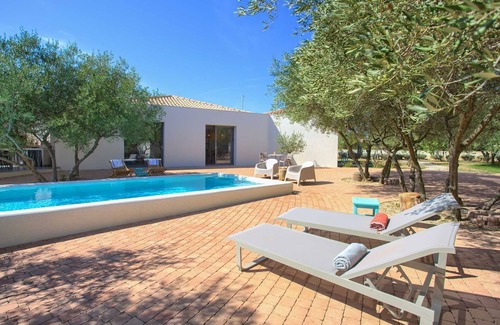 Margari Villas is a unique architectural space, perfectly integrated into the natural ambiance of olive groves, situated in the quiet village of Linardići on the island of Krk. The whole estate consists of several buildings, uniquely designed as indented multi-story ground floor houses, which surround a central atrium dominated by old olive trees and Mediterranean plants, with an infinity pool in the center. It is a space for socializing, relaxing, and enjoying nature. Interestingly, the space of the houses was built in such a way that the old olive grove determined the position of individual parts of the building, so Margari represents three buildings, the first of which is the entrance space and reception with front parking.There is an entrance to the biggest house with a living room and dining room, and two bedrooms with private bathrooms with a shower and walk-in wardrobe. Each room also has access to the courtyard with its terrace. From the living room, you exit to the central atrium with a swimming pool, as well as a loggia for dining and barbecue, and a cantilevered balcony. From the central courtyard, you enter a small house dominated by a spacious kitchen with a kitchen island and a space for socializing with the preparation of culinary delicacies. From this space, you enter two bedrooms, equipped with private bathrooms walk-in wardrobes, and private terraces. From this building, you can reach the backyard with olive groves and Mediterranean plants, as well as the back parking lot and the entrance to the plot. There are 4 bicycles at your disposal, and pets are welcome. Margari Villas is the place where you'll enjoy your perfect vacation in a natural and authentic environment.
