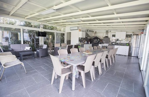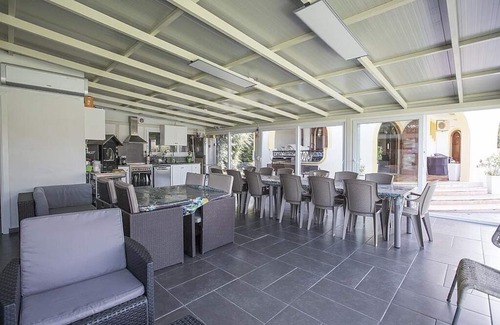 The verandah is 30 square meters (320 square feet) large. You will be able to reach it from the swimming pool area. Is equipped with sofas and armchairs, and you will find a satellite television (local channels). You will find a table and chairs. There is also a cooking area. The kitchenette is equipped with a six-burner gas cooker, an electric oven, a refrigerator with freezer, a dishwasher, an Italian-style coffee-maker and other small appliances. From the verandah you will enjoy a broad view of the swimming pool. The verandah is equipped with an air conditioning/heating unit.