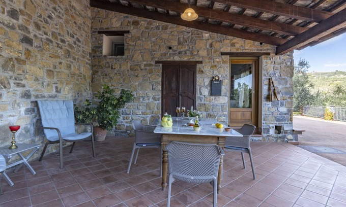 "Villa Matisse", 2-room house 75 m2. Stylish furnishings: 1 room with 1 bed (80 cm), 1 french bed (160 cm), shower/WC. Exit to the terrace. 1 room with 1 french bed (160 cm), shower/WC. Kitchen-/living room (dishwasher, 4 gas rings, toaster, kettle, microwave, freezer, electric coffee machine) with dining table, satellite TV and hi-fi system. Exit to the terrace. Electric heating, air-conditioning. Large terrace roofed. Terrace furniture, barbecue, deck chairs (4). Beautiful view of the countryside. Facilities: washing machine, iron, children's high chair, baby cot. Internet (WiFi, free). Maximum 3 pets/ dogs allowed. IT008021C2NVKOEEF5