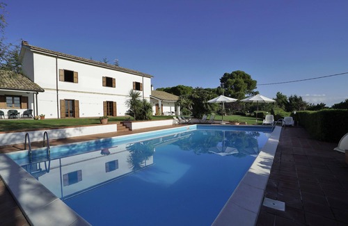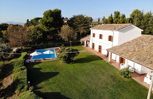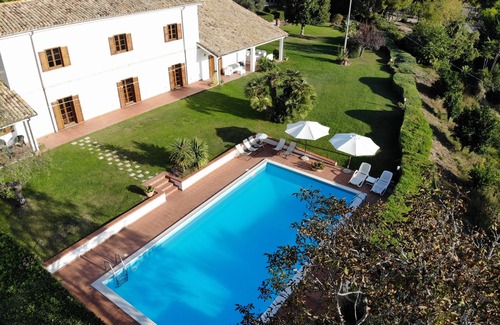The bedrooms located on the ground floor and first floor accommodate from 10 to 17 people, they are all five facing the sea side so they enjoy the beautiful view of the coast of the overflows and give on the 6x12 pool arranged on the long side of the house, all the villa is paved in Tuscan terracotta, also in the area of the 2 porticoes (front front entrance and rear to protect the kitchen entrance), in the pool edge and in the perimeter of the house. The entrance opens onto the driveway leading to the abbey, providing access to the villa passing through agaves of great height, surrounded by olive trees and pines and olive trees as a backdrop. The park is surrounded by a fence of pine and laurel 3 meters high, there is ample parking for guests.