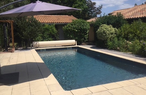 A l'extérieur, terrasse couverte, jardin sans vis à vis dans une impasse, piscine 9 x 4, spa, barbecue.
