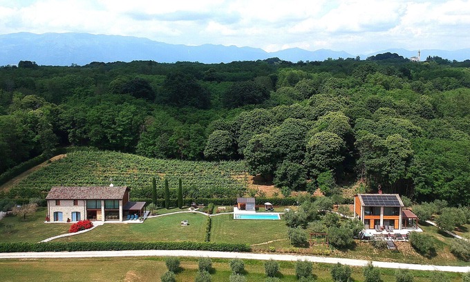 Immersed in the green Montello hills and surrounded by olive trees, this splendid complex consists of two villas located on either side of the private pool. The southern exposure in full sun and the mountains sheltering to the north allow guests to enjoy the garden and the wonderful outdoor swimming pool with sauna overlooking it, in complete privacy, even in the intermediate seasons. The indoor Turkish bath and the whirlpool bath with views over the Veneto plain complete the wellness offer.