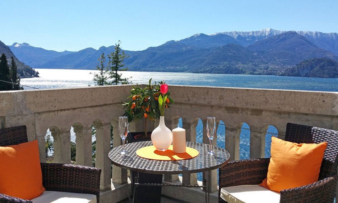 Villa Monti: an elegant 1910 liberty villa in Varenna with 6 brand new luxury apartments, stunning lake view, swimming pool and a nice garden. Apt. Tulip is a bright studio flat with a kitchen and a stunning lake view balcony.