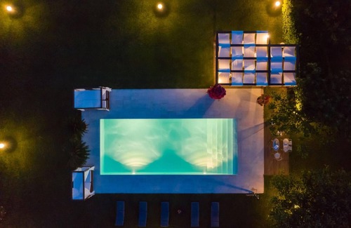 Villa Monticelli is a private villa with swimming pool in Le Marche region, nestled among the sun-drenched hills of Colli al Metauro. A refined and welcoming retreat, it reflects the understated and authentic beauty of Le Marche countryside, offering a panoramic location just 20 km from the Adriatic sea. The garden is a true corner of paradise, where centuries-old olive trees, fruit trees and fragrant flowers create a peaceful atmosphere to enjoy your holiday. At its heart lies a beautiful swimming pool with salt water and Roman staircase entrance, surrounded by elegant loungers with shade sails and traditional sunbeds, creating intimate corners where you can relax in total comfort. Adjacent to the pool, a gazebo hosts a fully equipped outdoor kitchen. On both sides of the house, two porches offer a warm and convivial atmosphere—ideal spaces for breakfasts, outdoor lunches and dinners lit by the soft glow of sunset. One of the porches connects directly to the barbecue area, perfect for evenings filled with the aroma of grilled food and shared laughter.