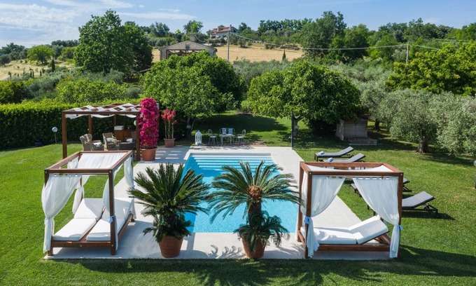 Best-rates for the Colli al Metauro villa starts from $554 per night with includes Private Pool, Security/Safety, Fireplace/Heating, Air Conditioner, View, Ocean View, Oceanfront, Bedding/Linens, Wellness Facilities, Child Friendly, Laundry, Parking, Pool, Internet, Kitchen, Barbecue/Outdoor Cooking, TV, Balcony/Terrace with all other amenities. Perfect for Weddings is committed to ensuring every guest experiences a comfortable and extraordinary stay, whether planning a romantic getaway, a honeymoon, a pet-friendly stay, or celebrating with the entire wedding party.