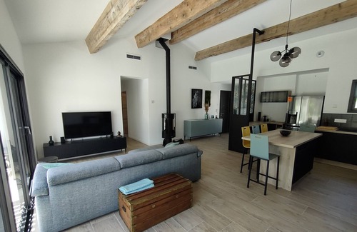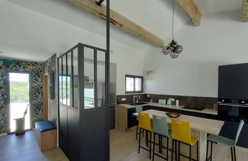 Situé entre mer et étangs, cette villa de plain pied est neuve avec cuisine toute équipée, à la décoration soignée. WIFI, piscine et douche extérieure. Secteur très calme.