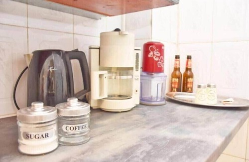 The contemporary, galley-style kitchen is well-equipped for those who enjoy cooking. Full-sized appliances include a refrigerator, stove, oven, microwave, and dishwasher. There are also dishes, silverware, pots, pans, a coffeemaker, a smoothie maker, and other kitchen essentials. There is also a clothes washer.