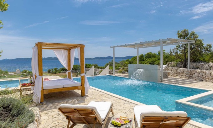 One of a kind charming property located right on the water in a secluded, quiet and tranquil bay. Villa Oasis provides comfort, luxury, relaxation, privacy and views of the gorgeous landscape in every direction. Without many neighbors around you are sure to have the beautiful blue Adriatic to yourself. Two levels occupy the villa. On the ground floor is a large, fully equipped, modern kitchen with a large dining table seating 12. Here are also two double bedrooms, a triple bedroom as well as two bathrooms. On the upper level are the remaining two double bedrooms, two bathrooms and a separate guest toilet, also a lounge with a sofa bed and a balcony. Facing the sea, each room allows for a breathtaking view. For your comfort and enjoyment provided are a gym, pool table, sauna, table tennis, children’s playground and a Jacuzzi. Impressive outdoor area provides covered lounge areas, alfresco dining, barbecue facilities, and stone deck to access the pool with a smaller section within for the little ones’ safety. If you fancy a swim early in the morning in the sea, you won’t go far as the access to the sea is at your doorstep.