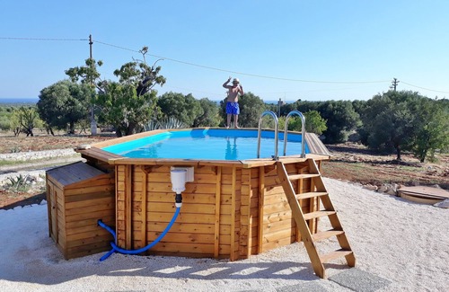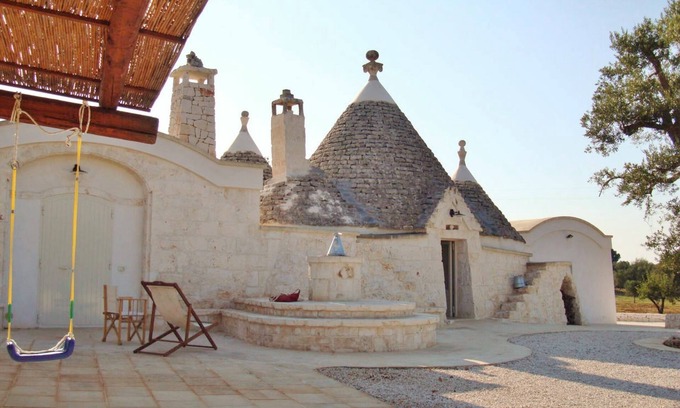 Spacious Italian villa (made of "trullo" cones), fully renovated with all comforts, immersed in centuries-old olive tree grove. Fresh during summer (also air conditioning), comfortable in other seasons, with in-floor heating. Rentable weekly/monthly (check price drop). Sea view. IDEAL FOR SELF-ISOLATION –see below. A trullo is a traditional Apulian dry stone construction dating from the 1500s. Swimming pool, inside dimensions: 553x342 cm; available June 1st-September 15th (use your own risk).