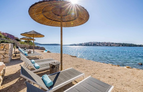 Welcome to Olive Vista 1, your exclusive retreat nestled in the tranquil village of Zatoglav near Rogoznica, Croatia. This luxurious villa offers more than just elegant design and stunning views—guests have exclusive access to a beach area, complete with deck chairs, sun umbrellas, and a dining table for unforgettable seaside meals. From this serene beach setting, you can unwind to the sound of gentle waves, enjoy sun-kissed afternoons, and savor meals by the Adriatic shore.