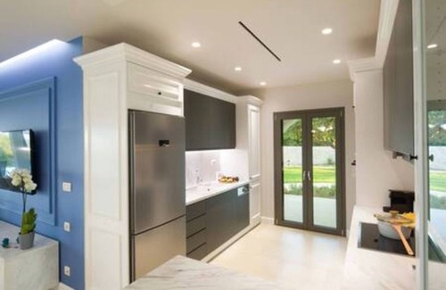Experience tranquility at Onore Villa, perfect for a serene holiday. With a contemporary design, stunning décor, and breathtaking sea views from its hilltop location in Dassia, it offers a modern retreat. Accommodating up to 10 guests, it's great for large families and groups. A two-story villa with 5 bedrooms, 4 with ensuite bathrooms, a spacious pool with panoramic sea views, a phototherapy sauna, fully equipped kitchen, smart TVs, a gym, WIFI, AC, and it's conveniently close to Dassia Beach.