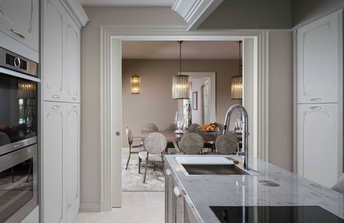 The wonderful front facade vividly evokes the beauty and luxury that await you inside and continues in the private garden. Entering the villa you will at first find yourself in a voluminous and airy foyer. The internal staircase leads to the bedrooms on the upper floors. From the foyer you can access the lavish living room Further, on the ground floor you will find the splendid dining room with a large table that seats 12 guests perfectly. The kitchen is a bit hidden from the direct view but is also very stylishly decorated. It is fully equipped, so if you love cooking you will enjoy using the top-of-the-line utensils and appliances in your own culinary show while on vacation!