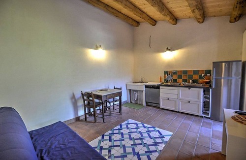 The living room is paved with terracotta tiles. The ceiling has characteristic exposed wood beams. The furnishings are simple and comfortable. The furnishings include a divan that unfolds into a double bed. In the living room you will also find a cooking area. The kitchenette is equipped with a two-burner gas cooker, a small electric oven, a small refrigerator without freezer and an Italian-style coffee-maker. The dining table can accommodate four guests. In this room you will find a satellite television (local channels). The room also has a window with a view of the patio.