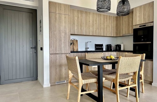 Step outside, and you’re welcomed by an elegantly designed terrace and a shaded outdoor kitchen, perfect for dining al fresco while soaking up the unforgettable Greek sunset. Relax by the plunge pool (3.3 x 4 meters), the perfect spot to cool off while savoring the views. The landscaped garden, filled with fragrant oleanders and traditional Greek herbs, immerses you in the natural beauty and scents of Greece.