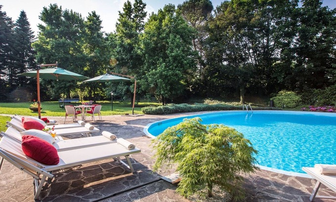 Villa Pina lies in the peaceful, green setting of Brianza, the ideal place for a holiday of relaxation, of culture with Crespi D'Adda, Monza and Bergamo, of food and wine with craft breweries and cured meats and of shopping in Milan in Via Della Spiga and Via Montenapoleone. This detached villa is surrounded by a park with swimming pool, sunbathing area and gazebo. The beautiful portico is organized as an outdoor dining area, perfect for alfresco meals in all tranquillity.
