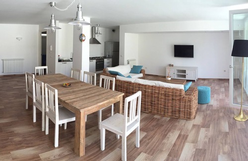 The large and bright living room has a large mango wood table cheerful dinner. All appliances: washing machine, dishwasher and refrigerator are new.
