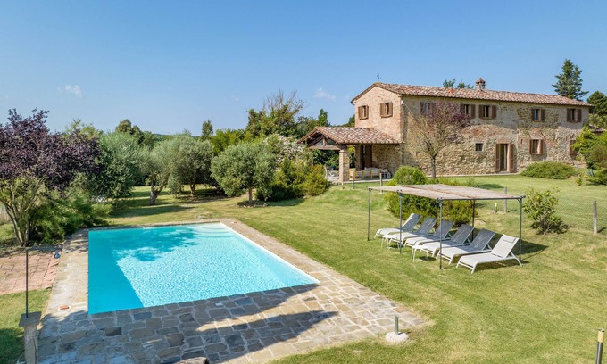 Magnificent Tuscan farmhouse totally restored, very close to the beautiful towns of Cortona and Montepulciano and minutes from Lake Trasimeno. The house has 4 bedrooms, powerful wi-fi, large kitchen, fireplace, private parking and study. The garden of 2500 square meters, includes a beautiful private pool. Surrounded by vineyards and oak and chestnut woods, it guarantees absolute relaxation and privacy. Ideal for 8/10 people.