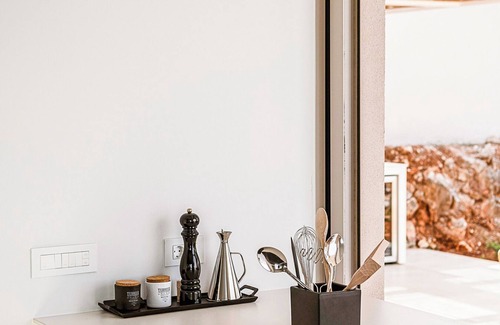 Perched high on the Cretan coast, Villa Rayora Chania is a striking example of contemporary minimalism, seamlessly blending with the Mediterranean landscape. Expansive picture windows flood the interiors with light, framing endless views of sea and sky to create a serene backdrop for your stay.
